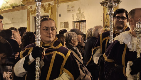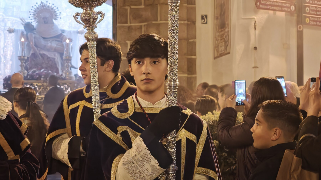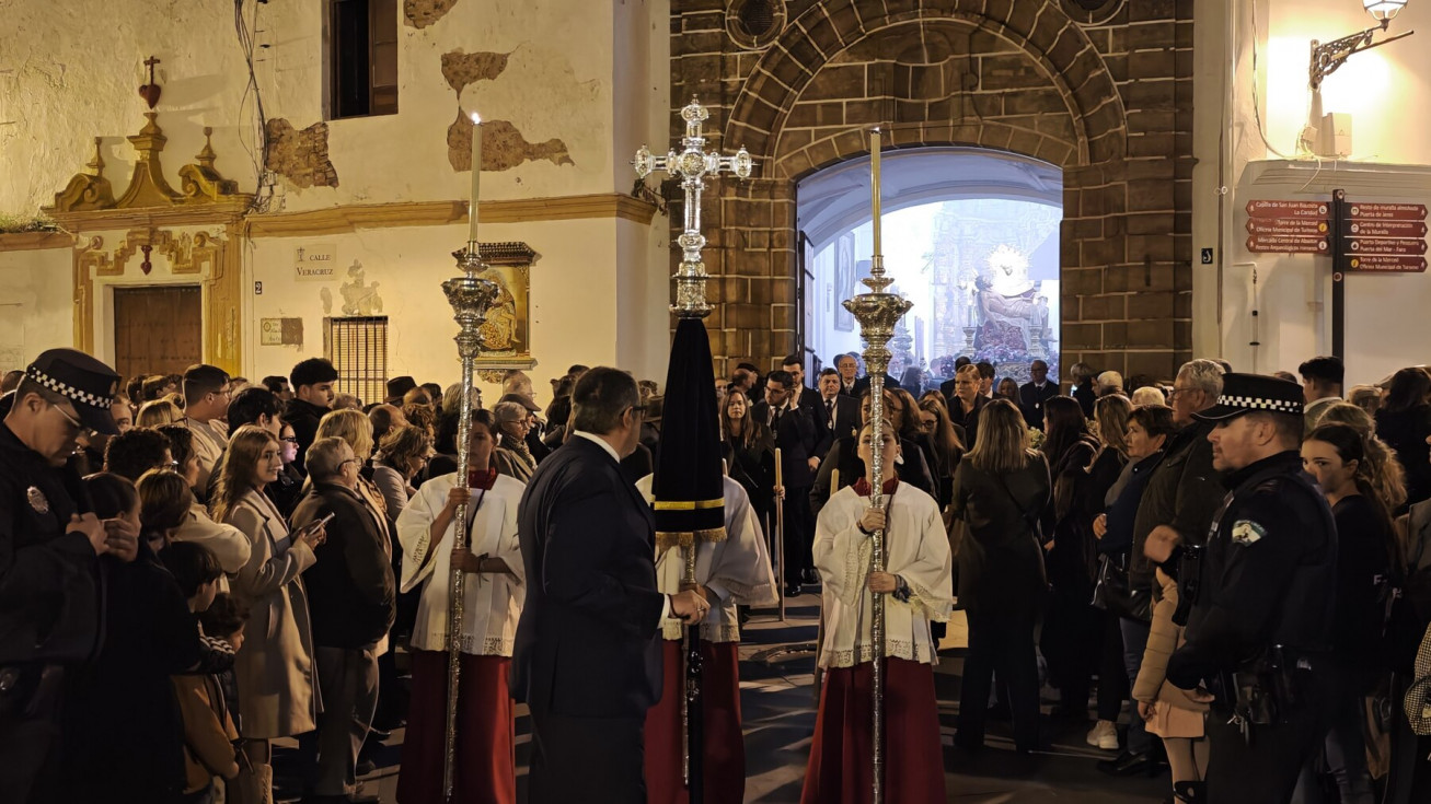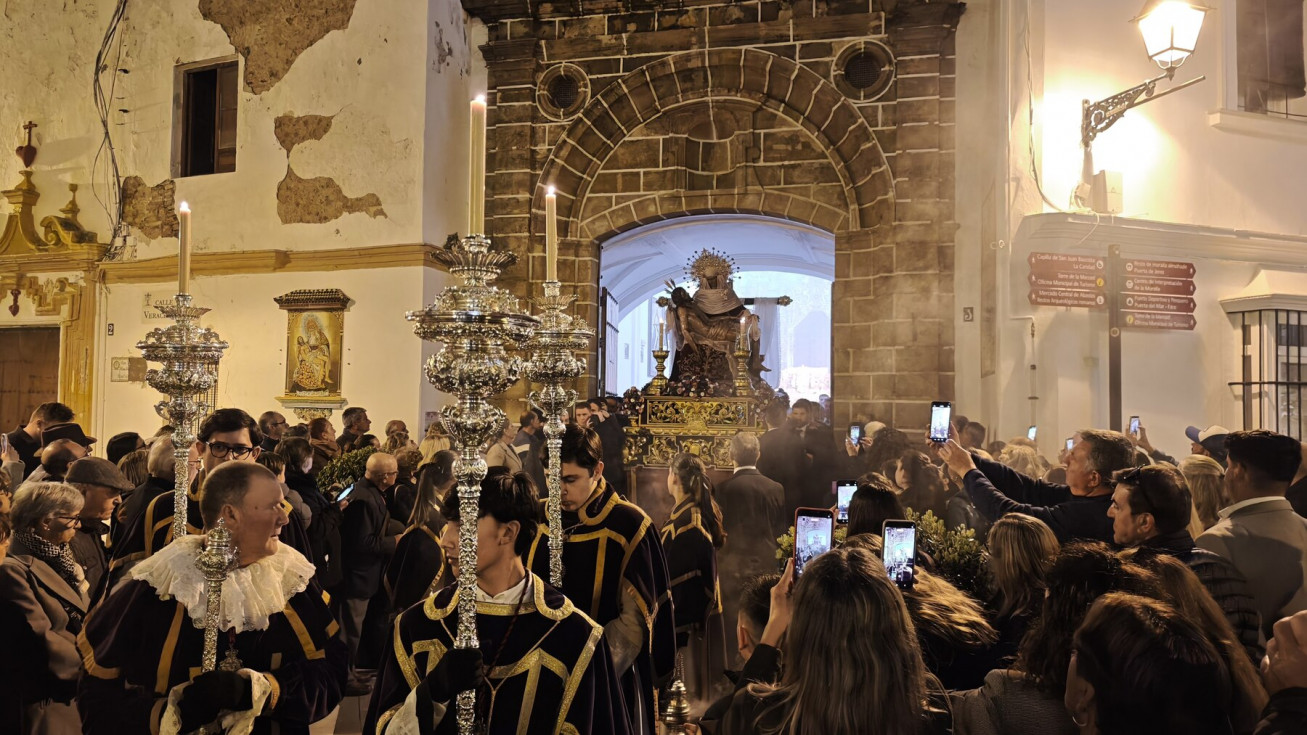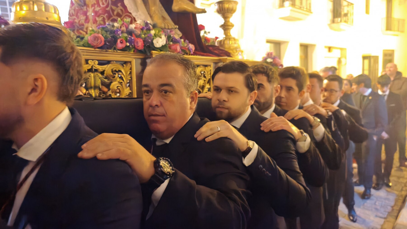 La salida en parihuela, portada por hermanos costaleros, y guiada por el capataz Manuel Acuña y su equipo, ha llenado la plaza de Andalucía, desde donde partía, y así ha seguido hasta la plaza Bartolomé Pérez, hasta que ha llegado a la parroquia de la O. Una iglesia que, por los problemas de desprendimientos que tiene la fachada, y que necesita una actuación urgente, estaba hoy con el frontal de andamios, como estará durante toda la Semana Santa.