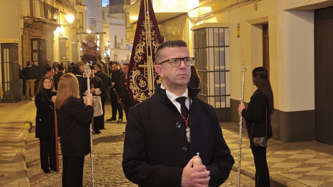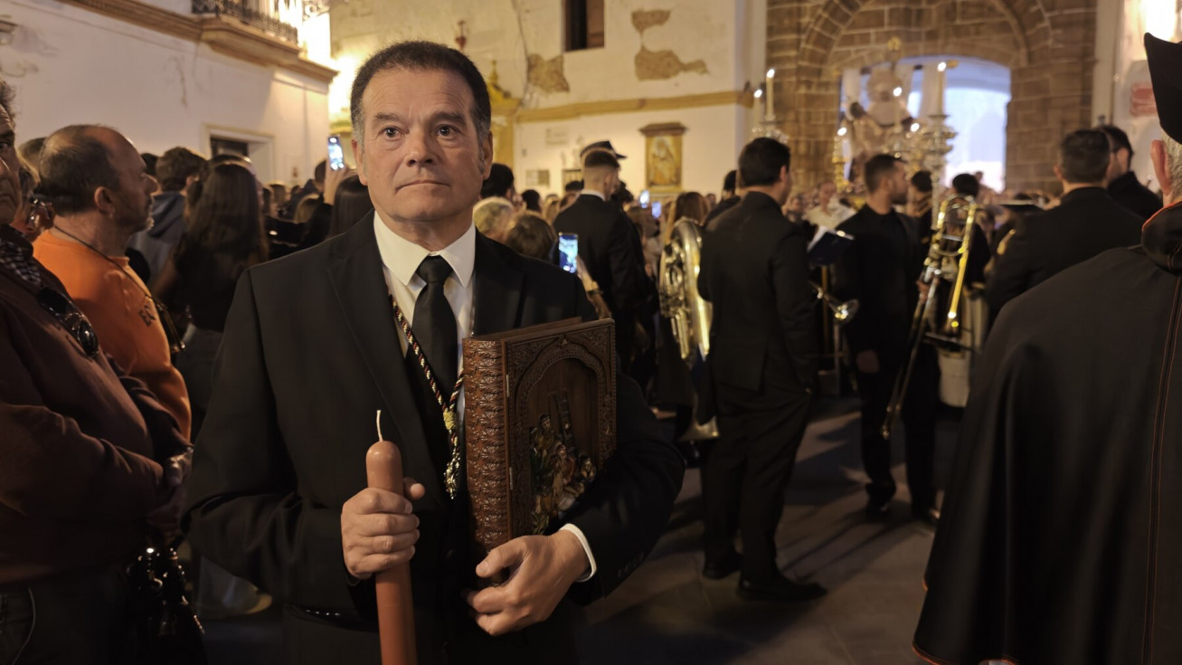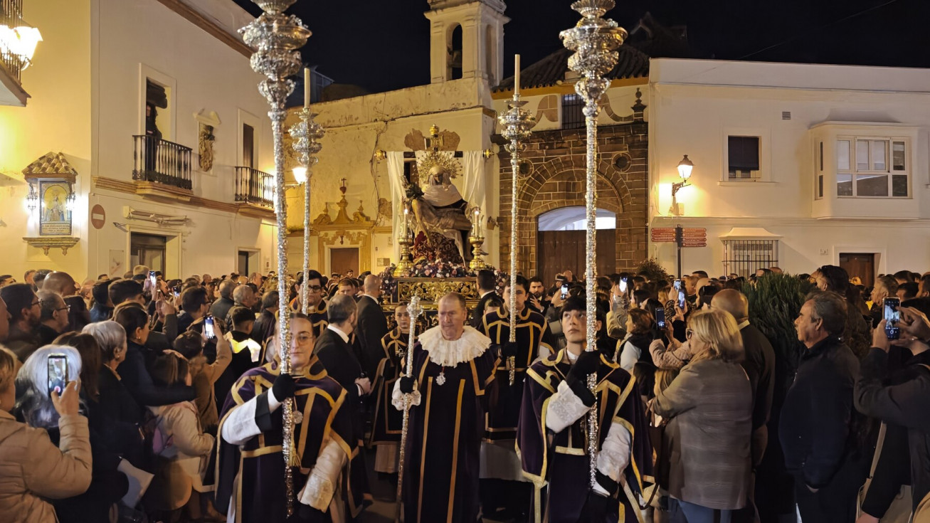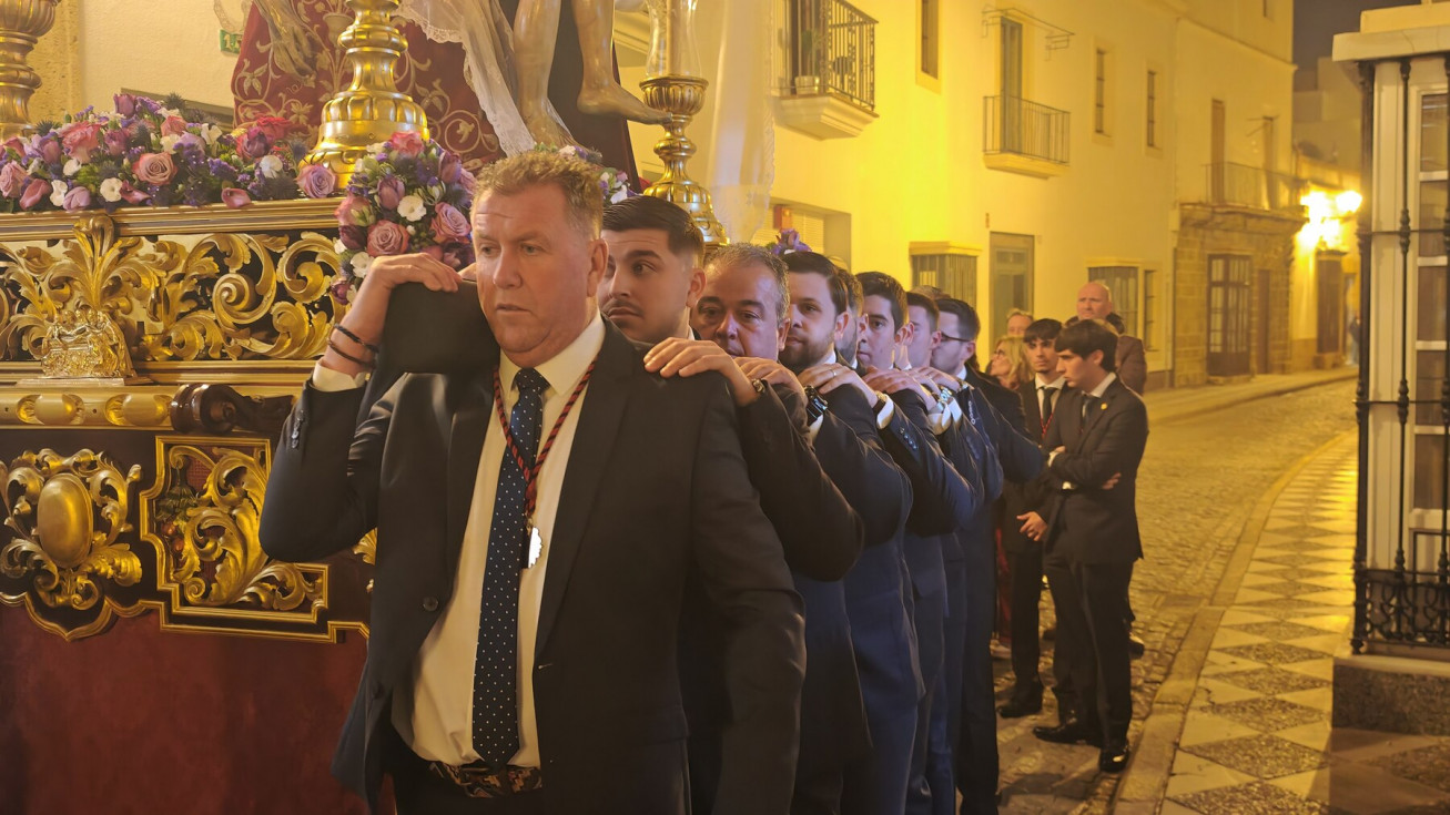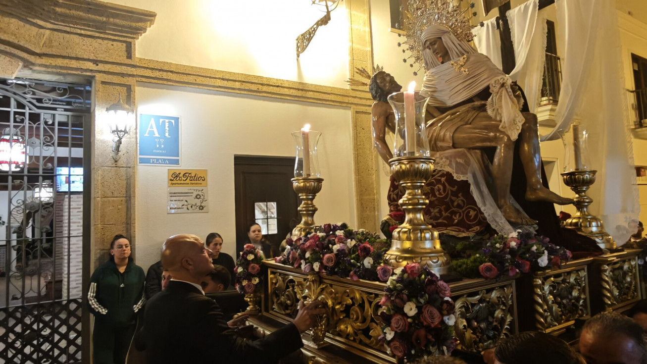 La salida en parihuela, portada por hermanos costaleros, y guiada por el capataz Manuel Acuña y su equipo, ha llenado la plaza de Andalucía, desde donde partía, y así ha seguido hasta la plaza Bartolomé Pérez, hasta que ha llegado a la parroquia de la O. Una iglesia que, por los problemas de desprendimientos que tiene la fachada, y que necesita una actuación urgente, estaba hoy con el frontal de andamios, como estará durante toda la Semana Santa.