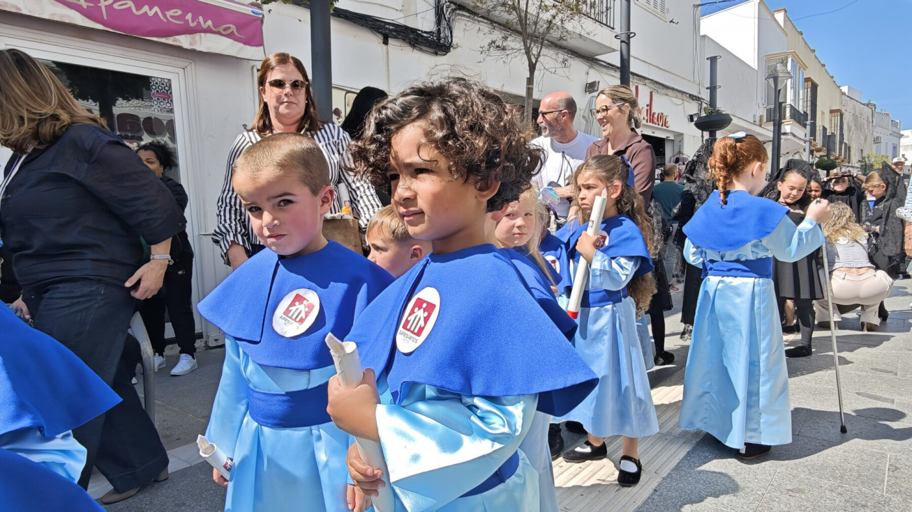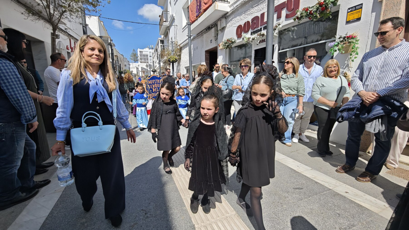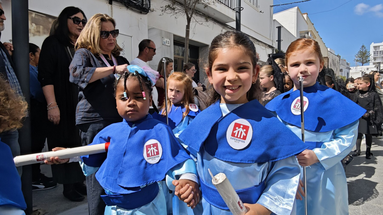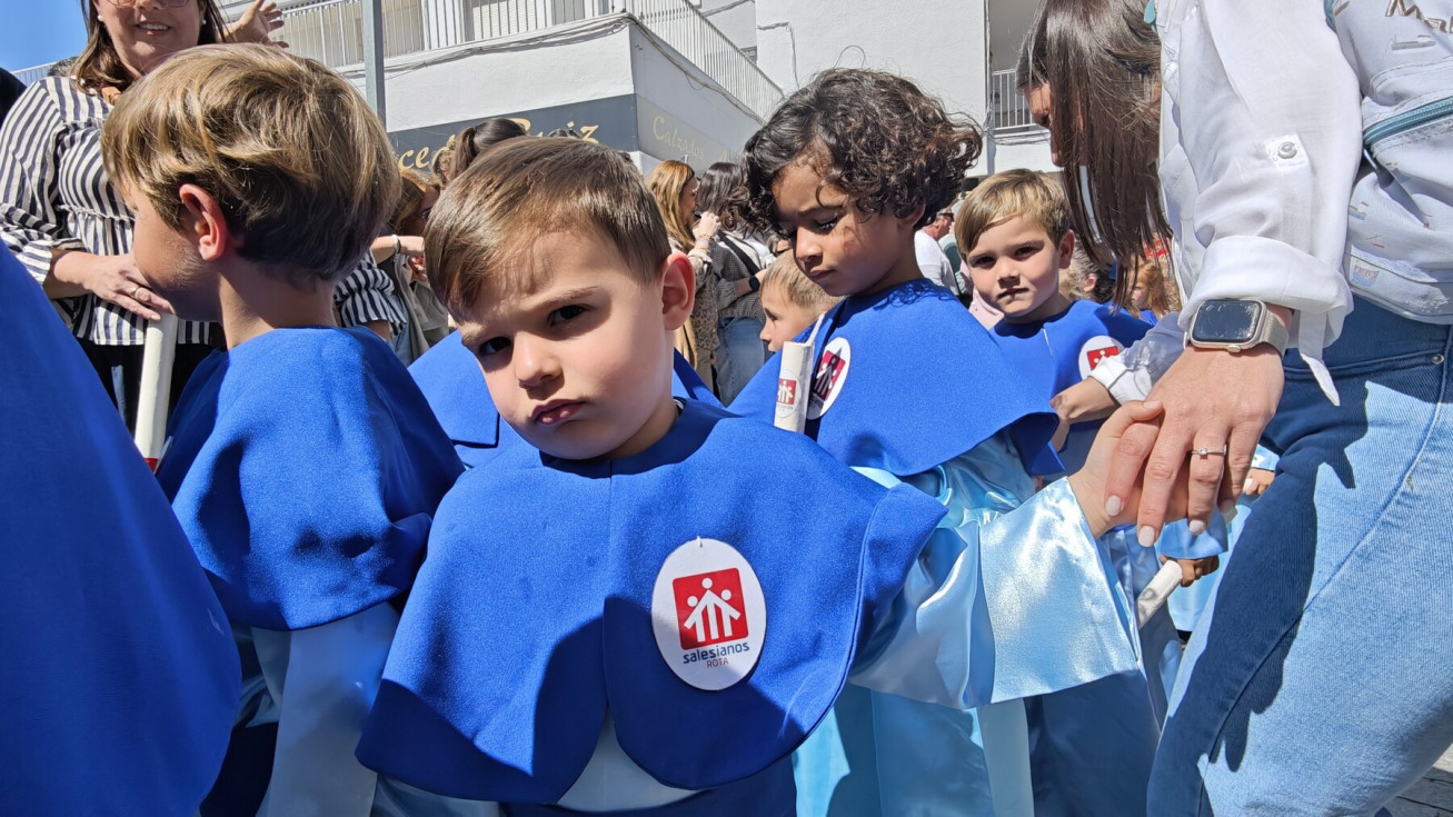 Como cada Viernes de Dolores, el centro de Rota se ha llenado de público sobre las doce del mediodía esperando ver la procesión infantil que cada año protagonizan los alumnos del colegio Salesianos que participan de forma activa en esta actividad.
