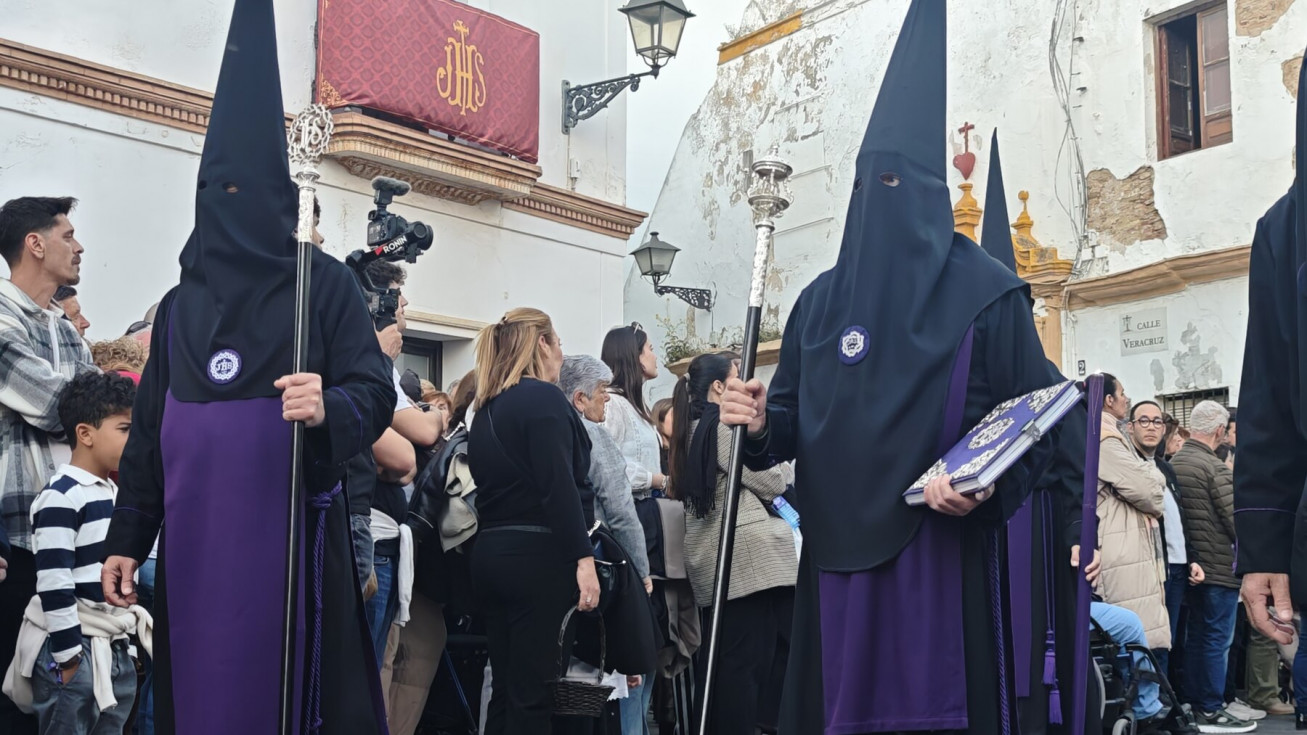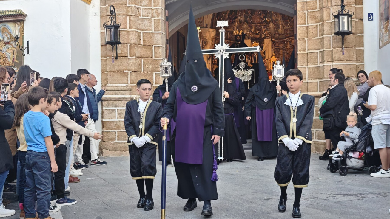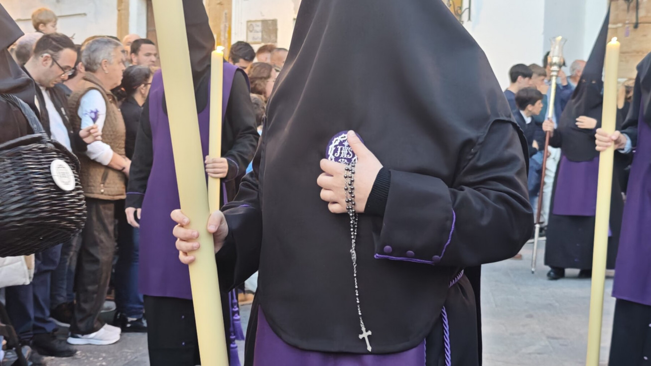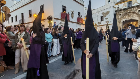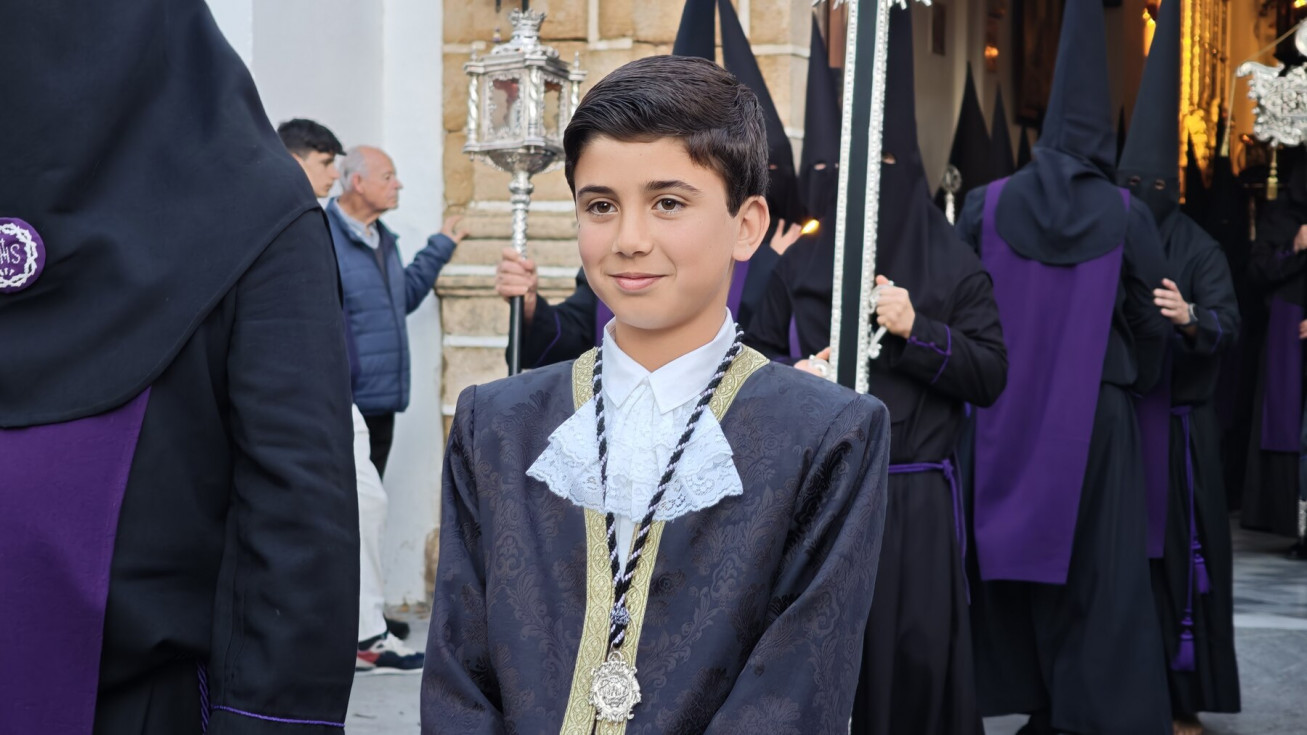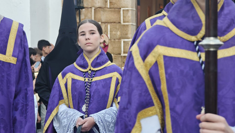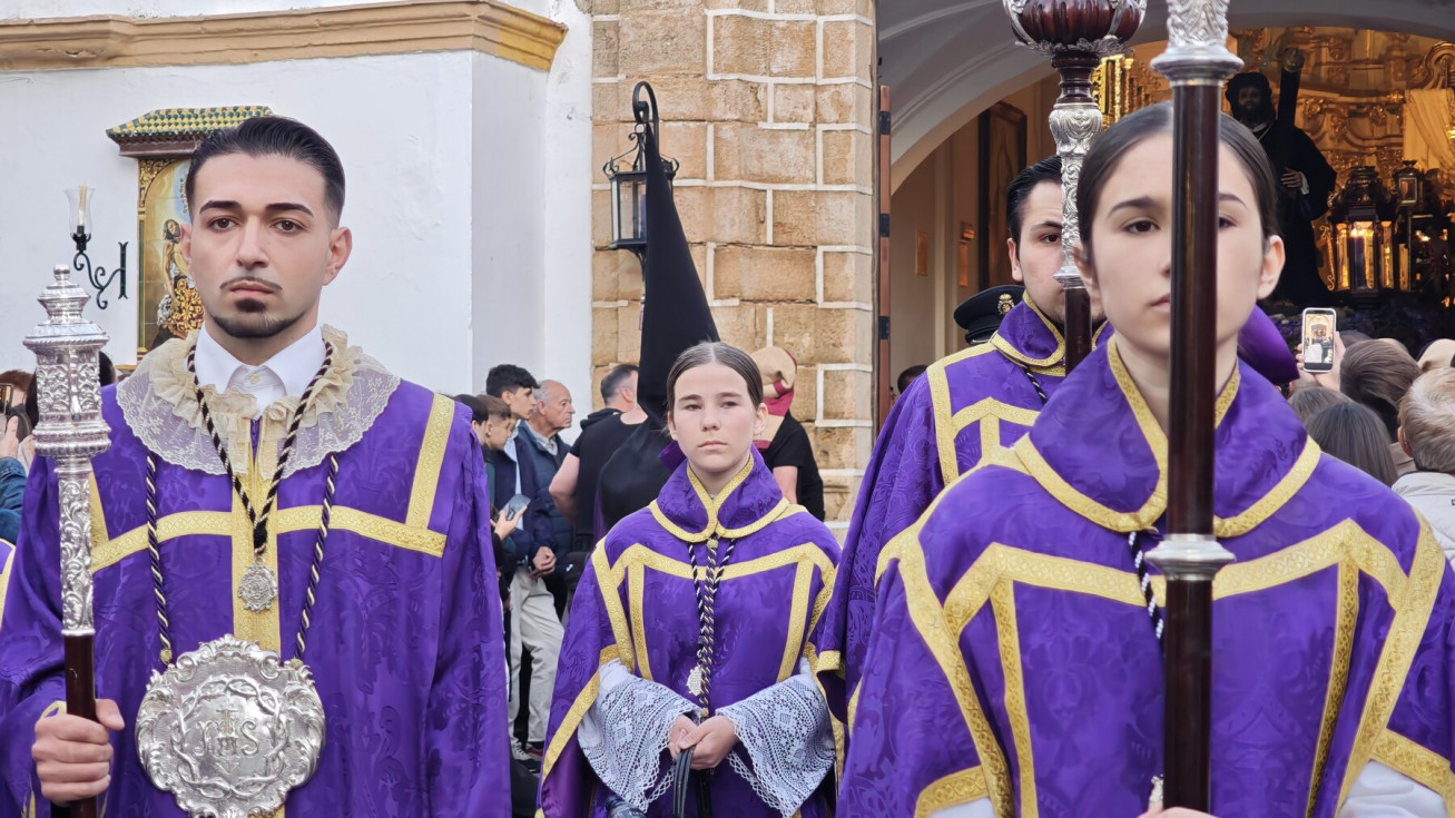 Tras las maniobras de rodillas para poder salir de la capilla de la Caridad, los roteños y visitantes han podido disfrutar de una salida procesional plena marcada por el paso solemne con el que desfilan los hermanos penitentes que arropan los dos pasos. Vestidos con túnica negra ceñida a la cintura con cíngulo morado y escapulario morado, destacaba este año, como desde hace ya algún tiempo, el aumento del número de jóvenes que llevan el hábito, que en su día formaron parte de la pavera y hoy a su corta edad, componen uno de los cortejos más consolidados en la calle. Entre cirios e insignias rompían la solemnidad de esta procesión los niños de la pavera que en un año han pasado a duplicarse siendo en esta Semana Santa un total de 42.