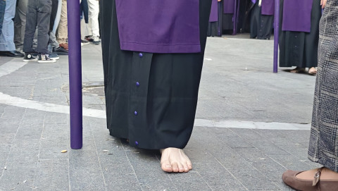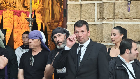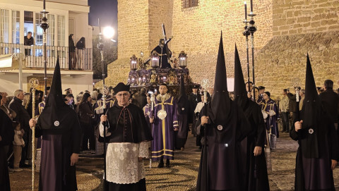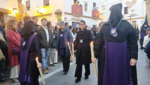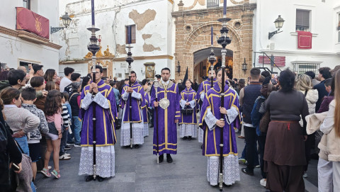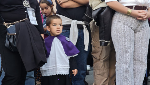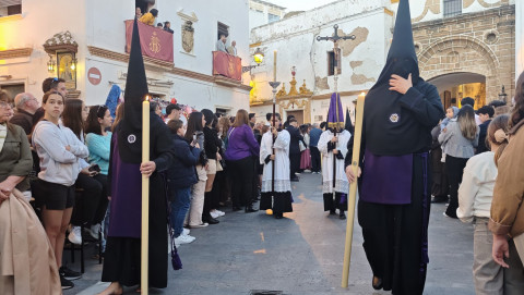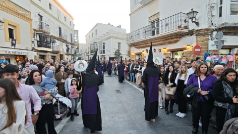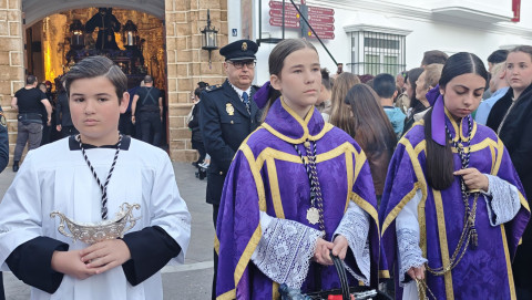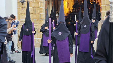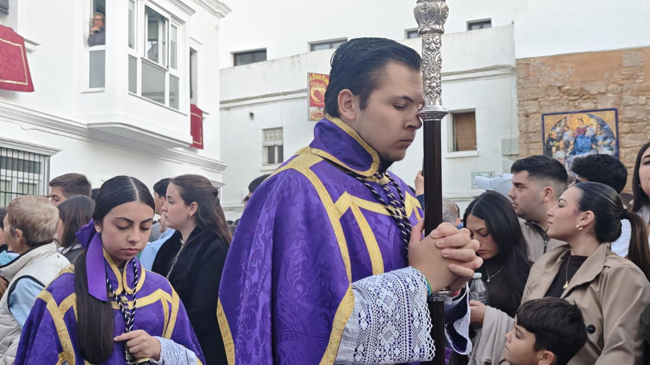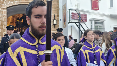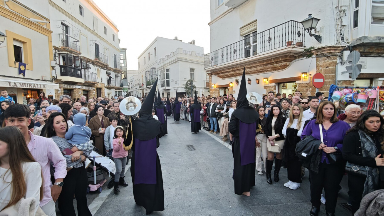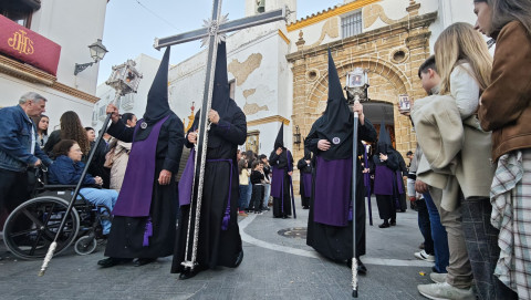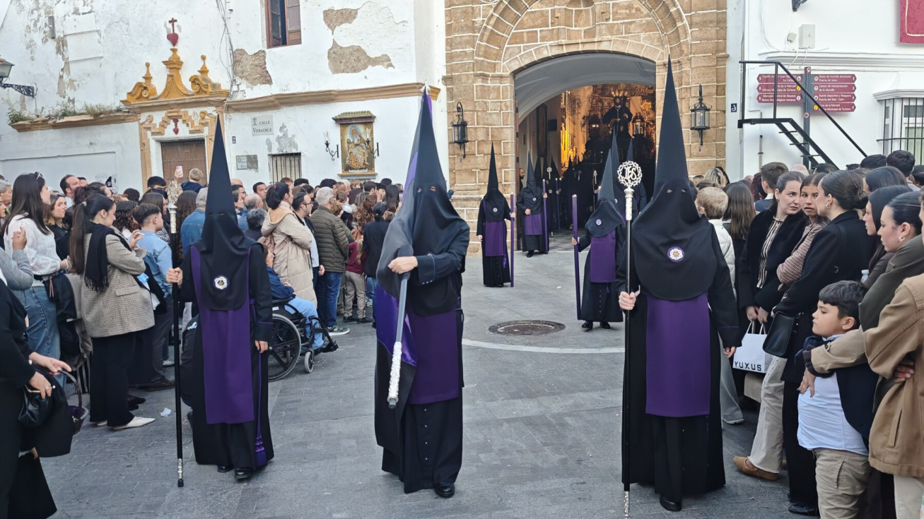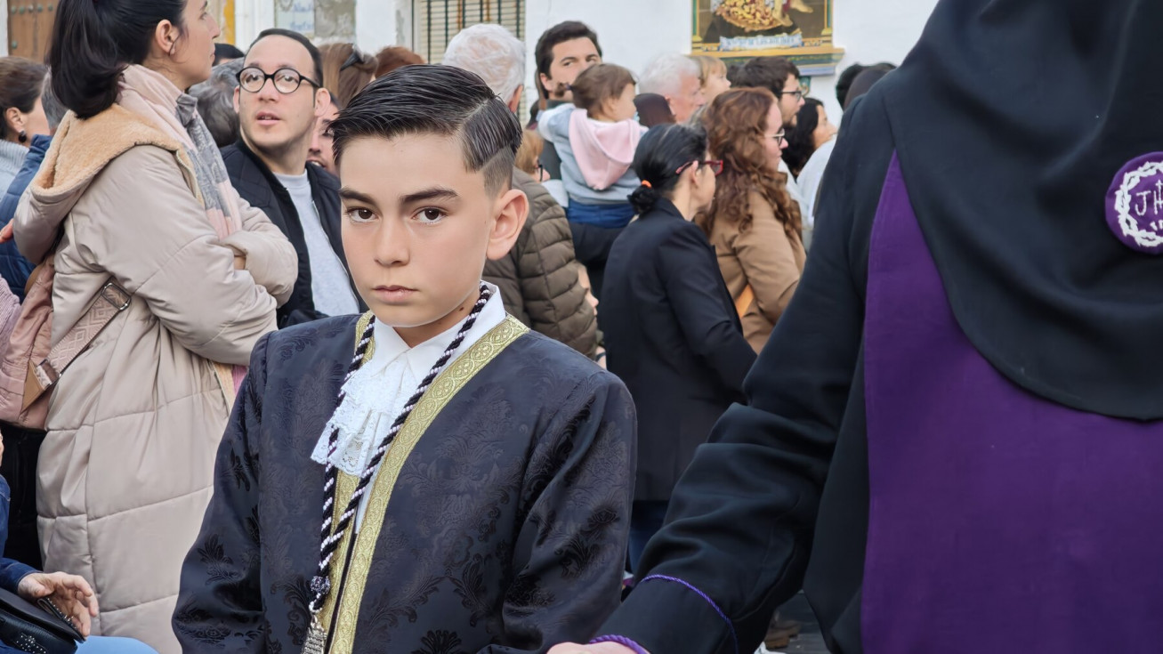 Tras las maniobras de rodillas para poder salir de la capilla de la Caridad, los roteños y visitantes han podido disfrutar de una salida procesional plena marcada por el paso solemne con el que desfilan los hermanos penitentes que arropan los dos pasos. Vestidos con túnica negra ceñida a la cintura con cíngulo morado y escapulario morado, destacaba este año, como desde hace ya algún tiempo, el aumento del número de jóvenes que llevan el hábito, que en su día formaron parte de la pavera y hoy a su corta edad, componen uno de los cortejos más consolidados en la calle. Entre cirios e insignias rompían la solemnidad de esta procesión los niños de la pavera que en un año han pasado a duplicarse siendo en esta Semana Santa un total de 42.