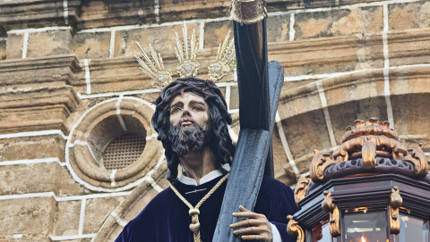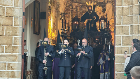 La capilla musical con Nuestro Padre Jesús de la Salud y las marchas de corte fúnebre que acompañaron desde el inicio a María Santísima de la Caridad, interpretadas por los 84 músicos de la Asociación Banda de Música Nuestra Señora del Carmen de Prado del Rey (Cádiz), han dejado una noche sobria, de recogimiento y luto. Un luto que también estaba presente en la candelería que lucía el paso de palio, que como marca propia incluye cada año velas con mucho significado, no solo una por cada uno de los hermanos fallecidos, pintadas a mano, y que en este 2026 han alcanzado las 20, sino otras tantas que están relacionadas con la idiosincrasia de la hermandad y que pinta a mano la hermana María Niño Pérez desde hace 13 años.