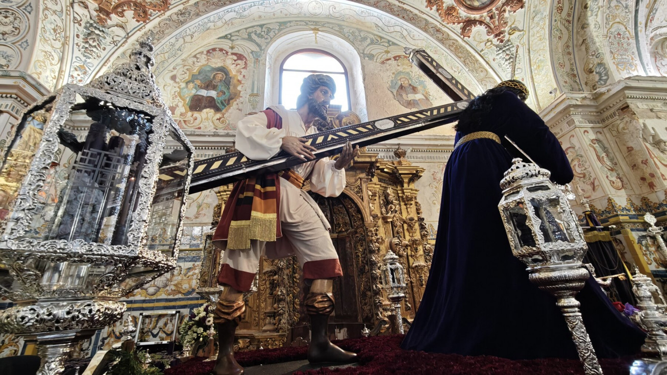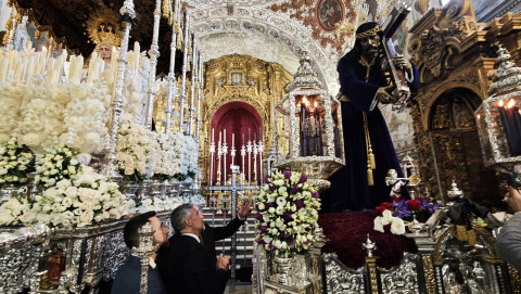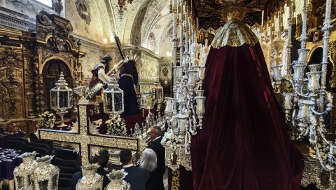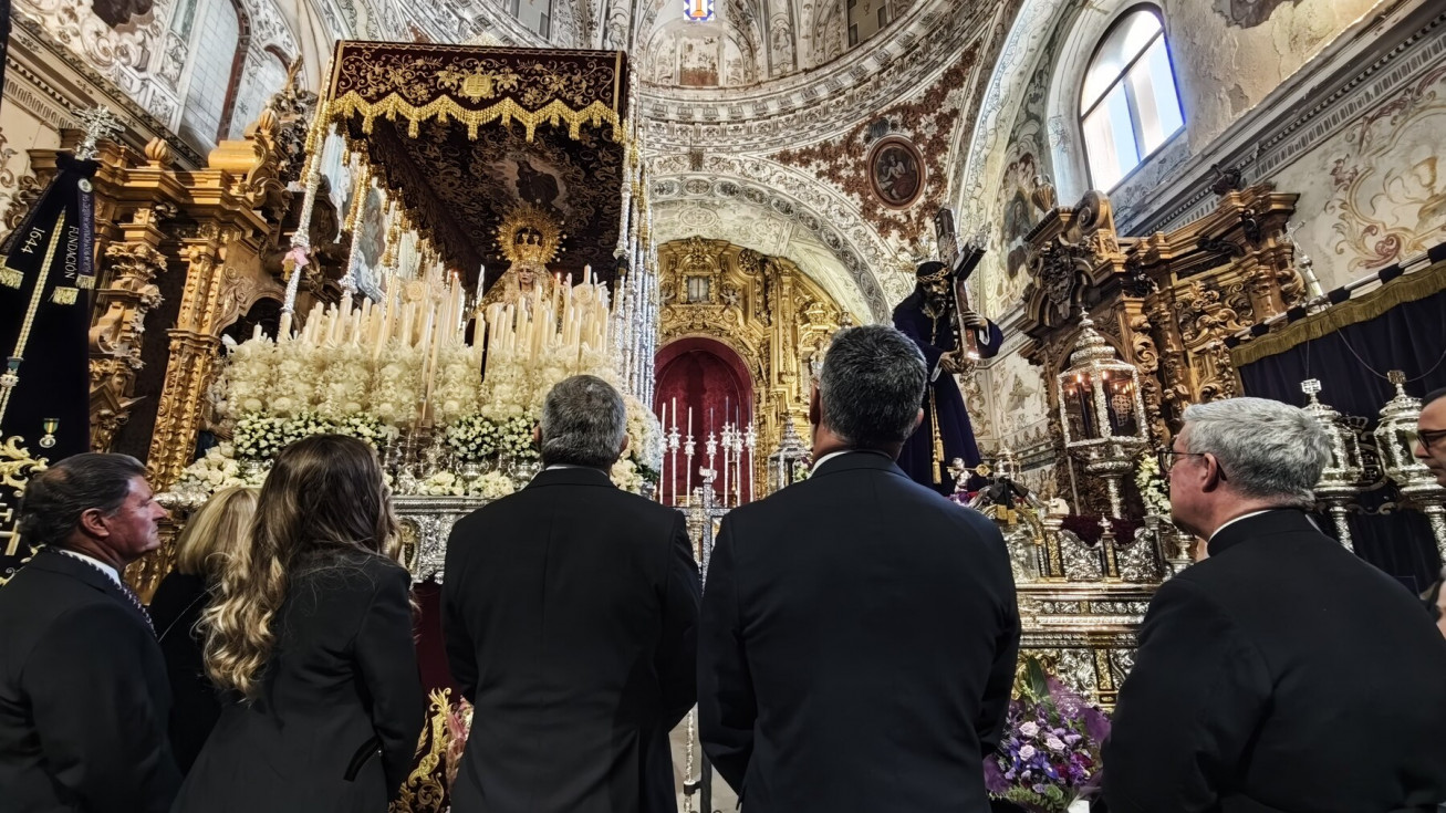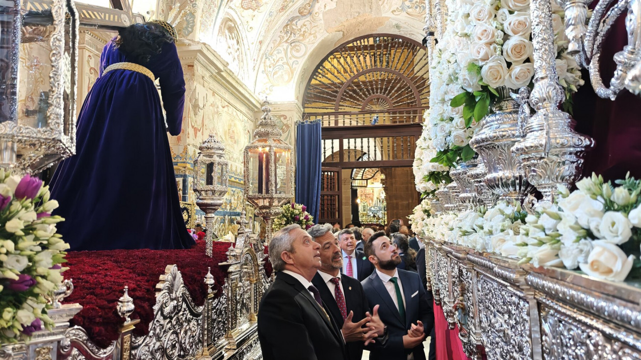 Esta mañana, preparado en su paso junto a María Santísima de la Amargura, listos para iniciar su estación de penitencia a las 2 de la madrugada, el alcalde de Rota, Javier Ruiz, junto a miembros de la Corporación municipal y de la junta de gobierno, así como fieles y devotos, han participado en este momento que representa la vinculación histórica de Jesús Nazareno con su pueblo.