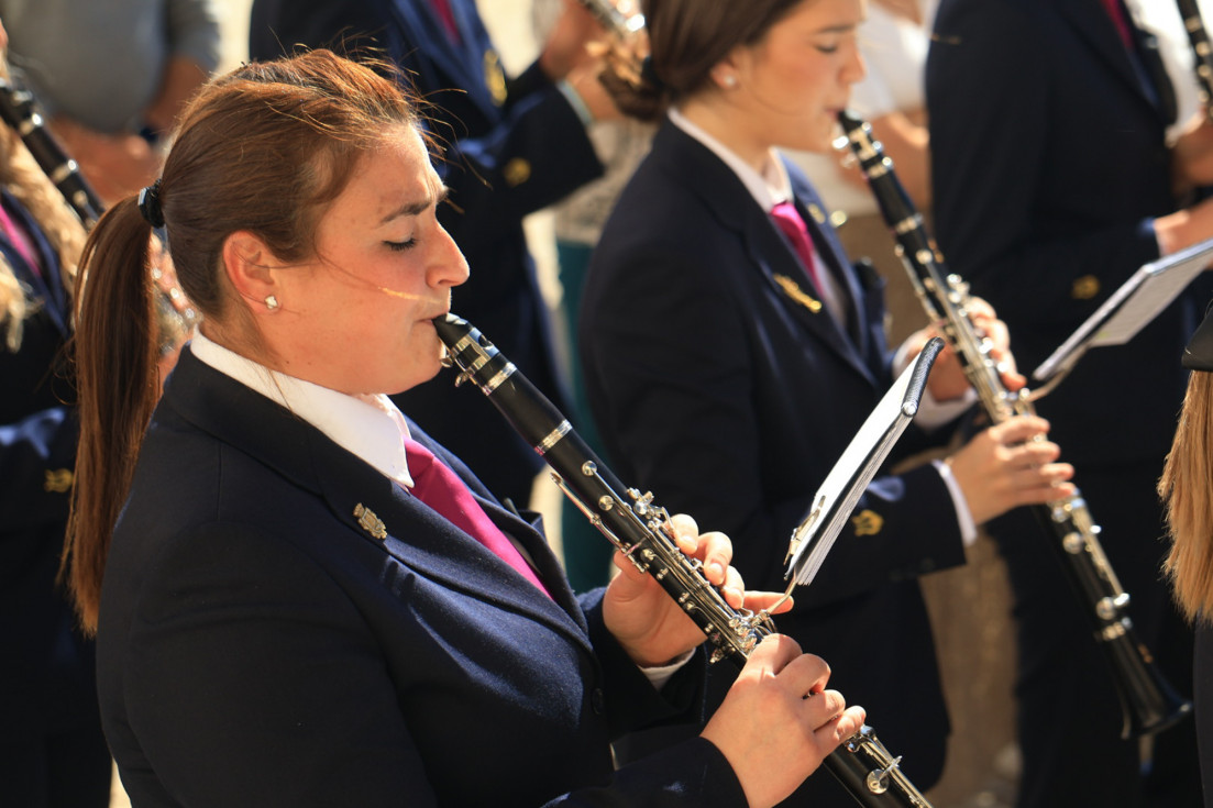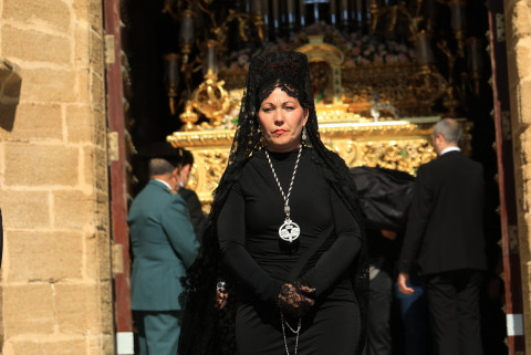 Las notas fúnebres de la capilla musical "Lux Aeterna" acompañaban al Cristo en su lecho mortuorio y la Banda Musical Gastoreña, que cumplía 26 Semana Santa en Rota con el Santo Entierro, dedicaba marchas a una virgen que llora al pie de la cruz la muerte de su hijo y que lucía como señora del Sábado Santo vestida con saya y manto negro bordado.