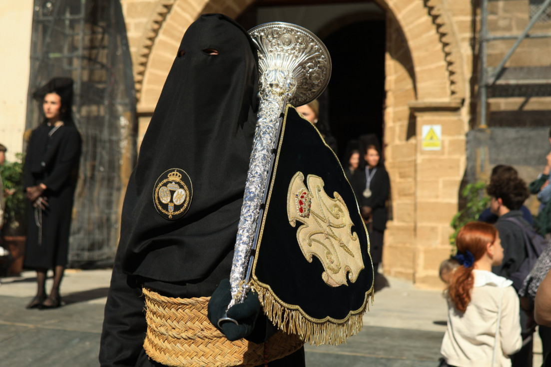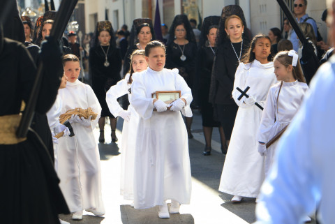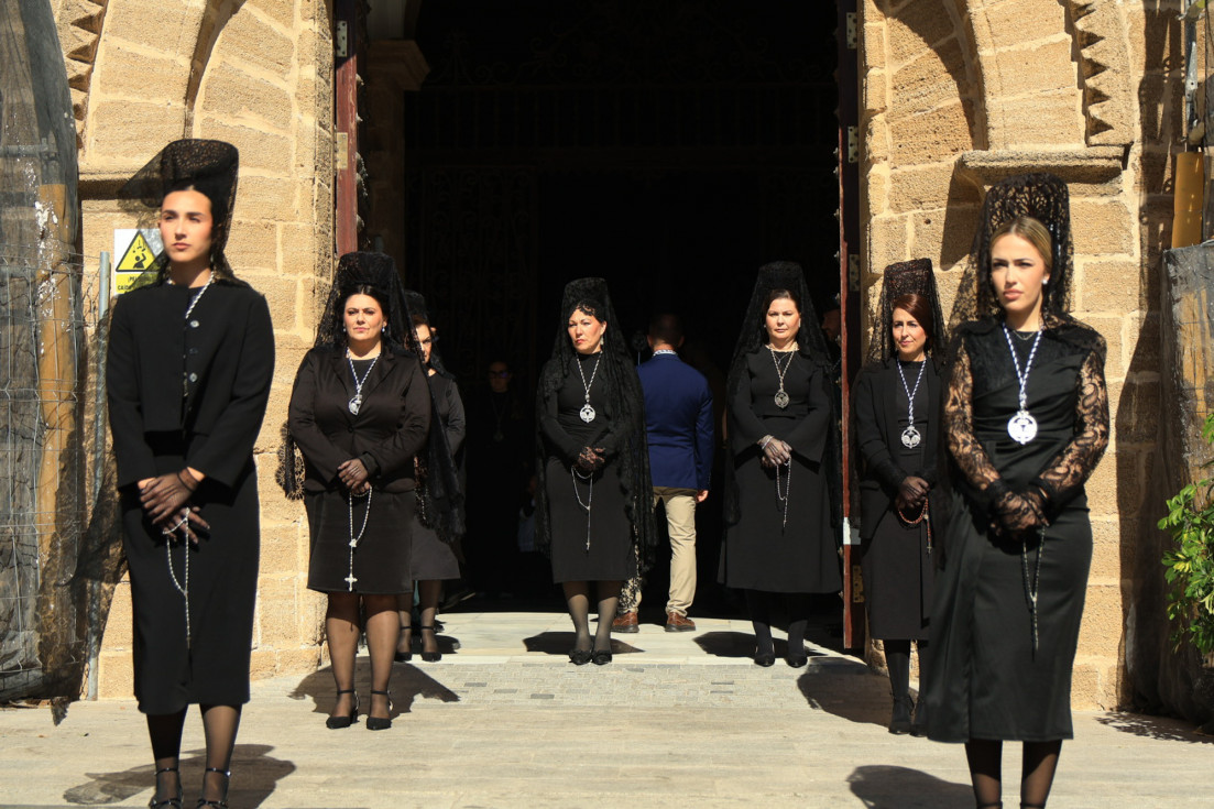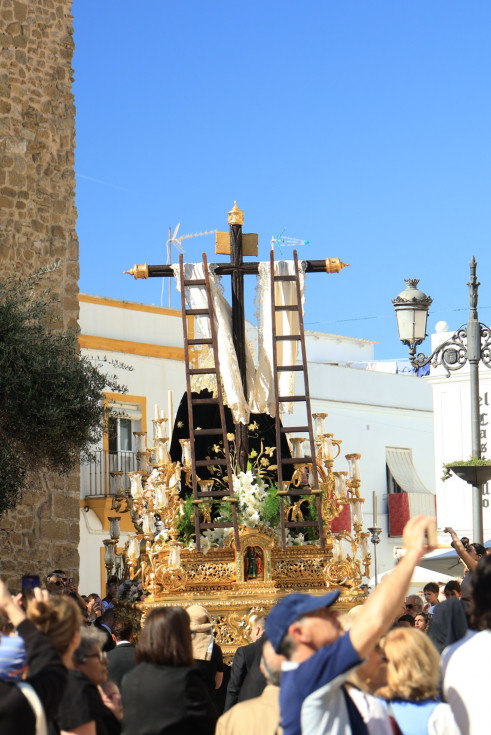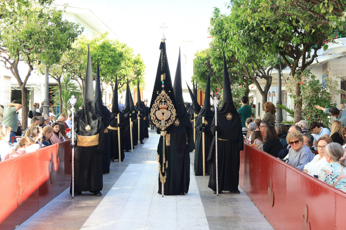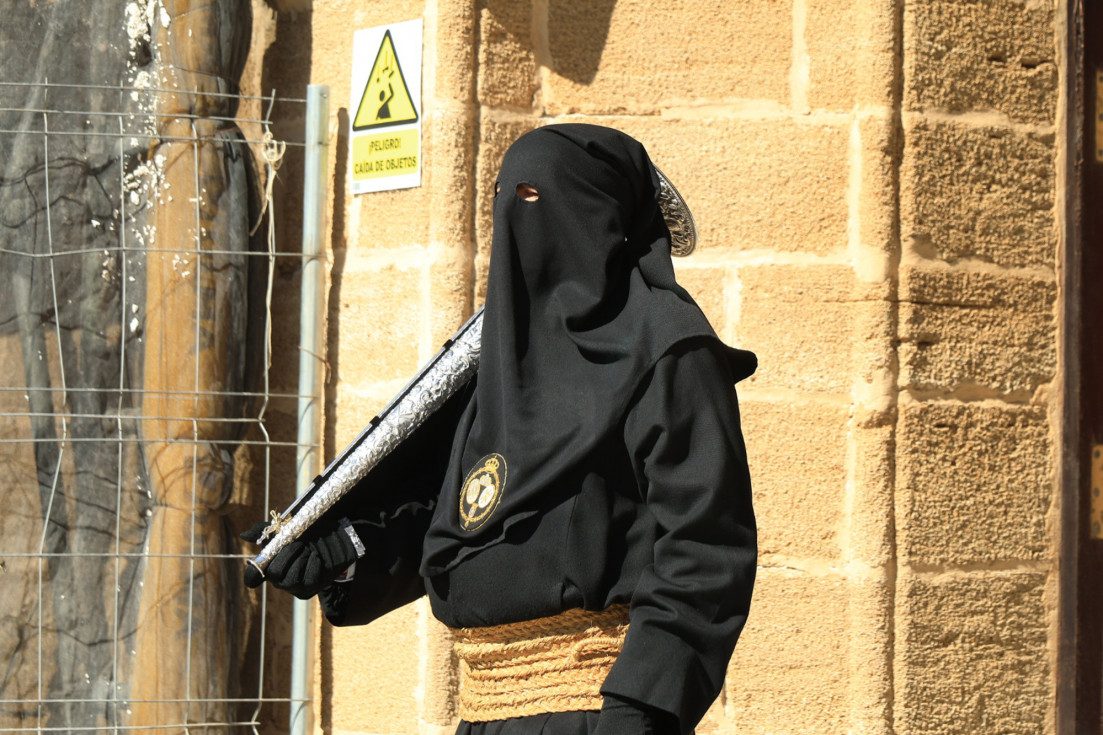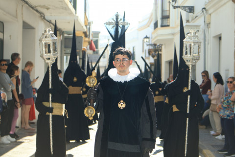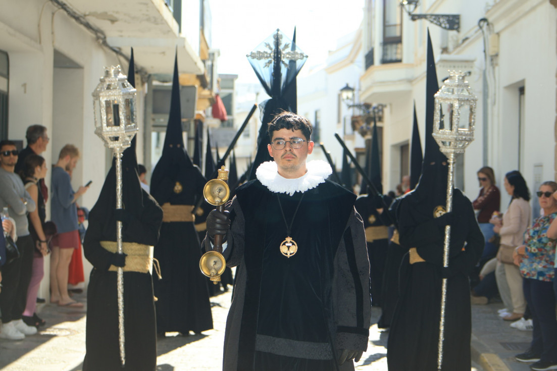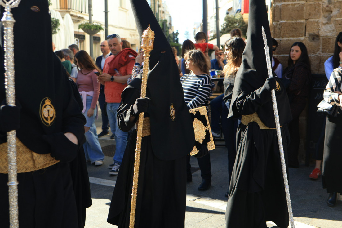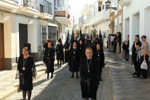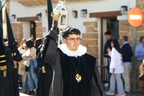 Con hábito negro con cola y cinturón de esparto, los 115 hermanos portaban cirios e insignias por las calles de una localidad que se vuelca con esta salida en la que destaca el grupo de mujeres de mantilla, la pavera o la representación del Almirante de la Base y la Guardia Civil, además de la presencia de hermanos de otras hermandades que se abrían paso por el casco histórico durante casi cuatro horas, tiempo en el que los dos pasos caminaron de manos de los capataces Manuel Jesús Fénix Real con el Cristo yacente y Juan José Cañas Martín-Niño, que se estrenaba al frente de la cuadrilla con su equipo llevando a la virgen que, aunque perdió en esta estación de penitencia uno de los puntos referentes como el paso por debajo del Arco de la Villa, debido a las obras de la plaza de España, pudo disfrutarse en otros enclaves. El tono de solemnidad y recogimiento que marca el Sábado Santo tuvo su contraste en el bullicio de la calle.