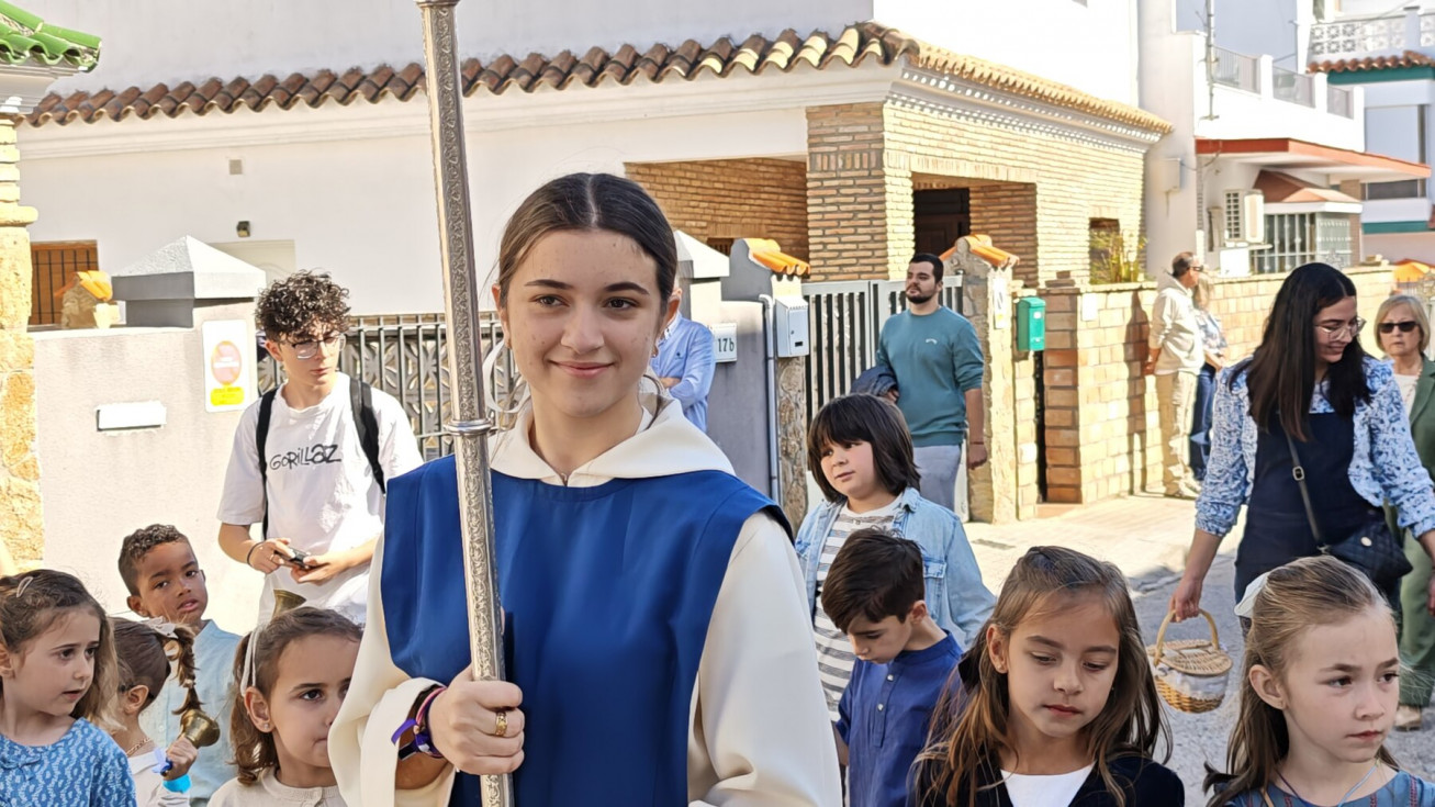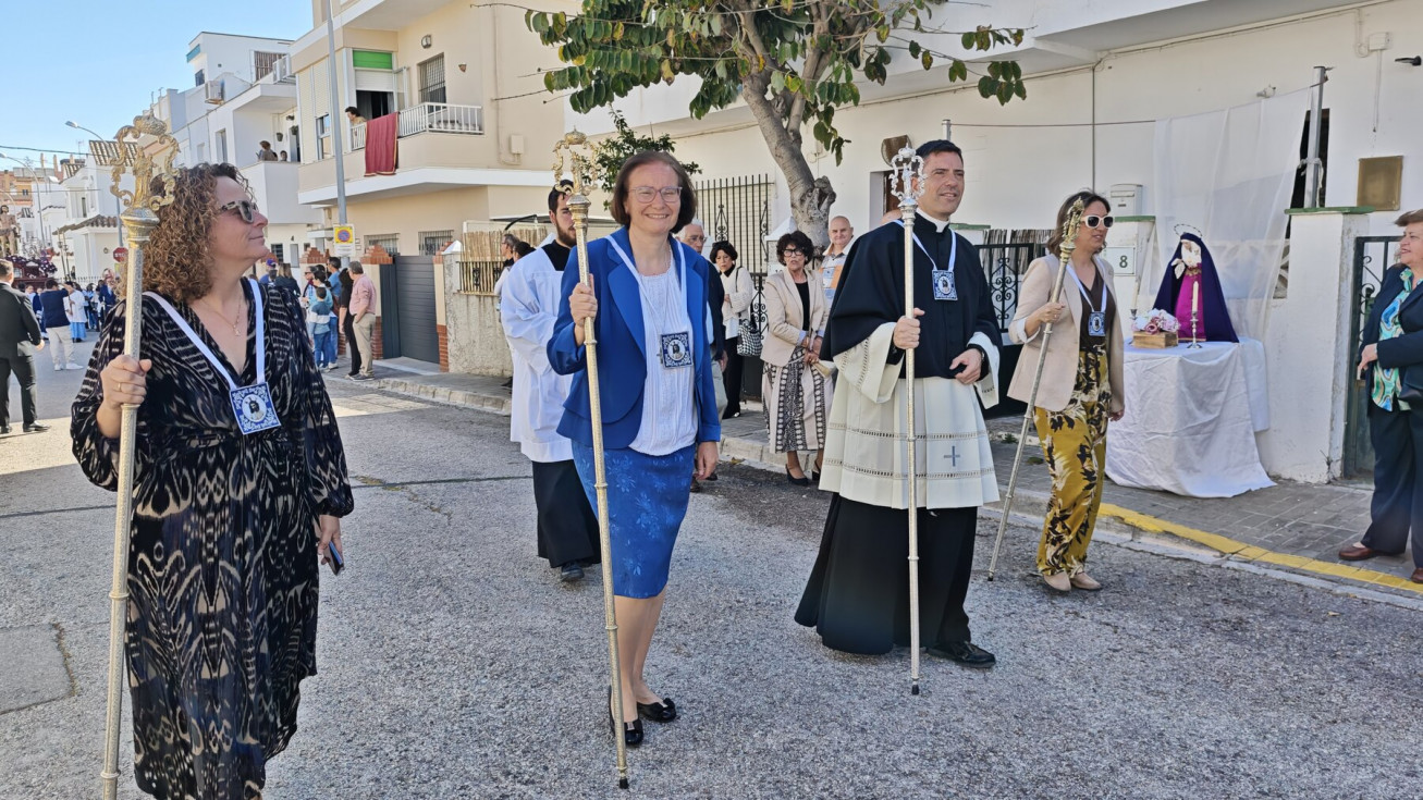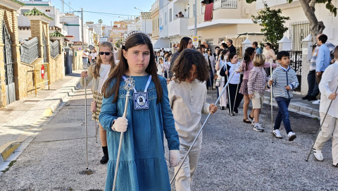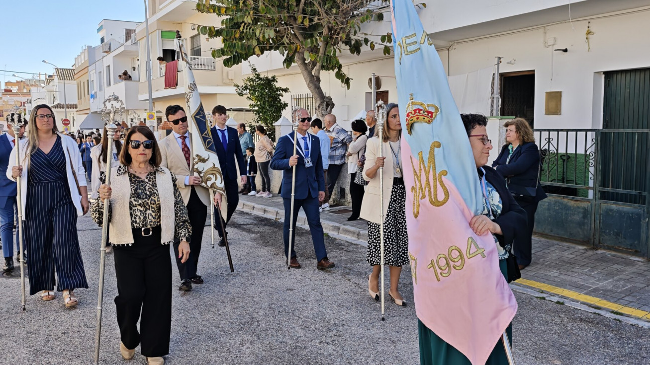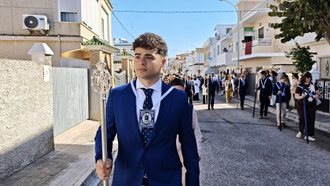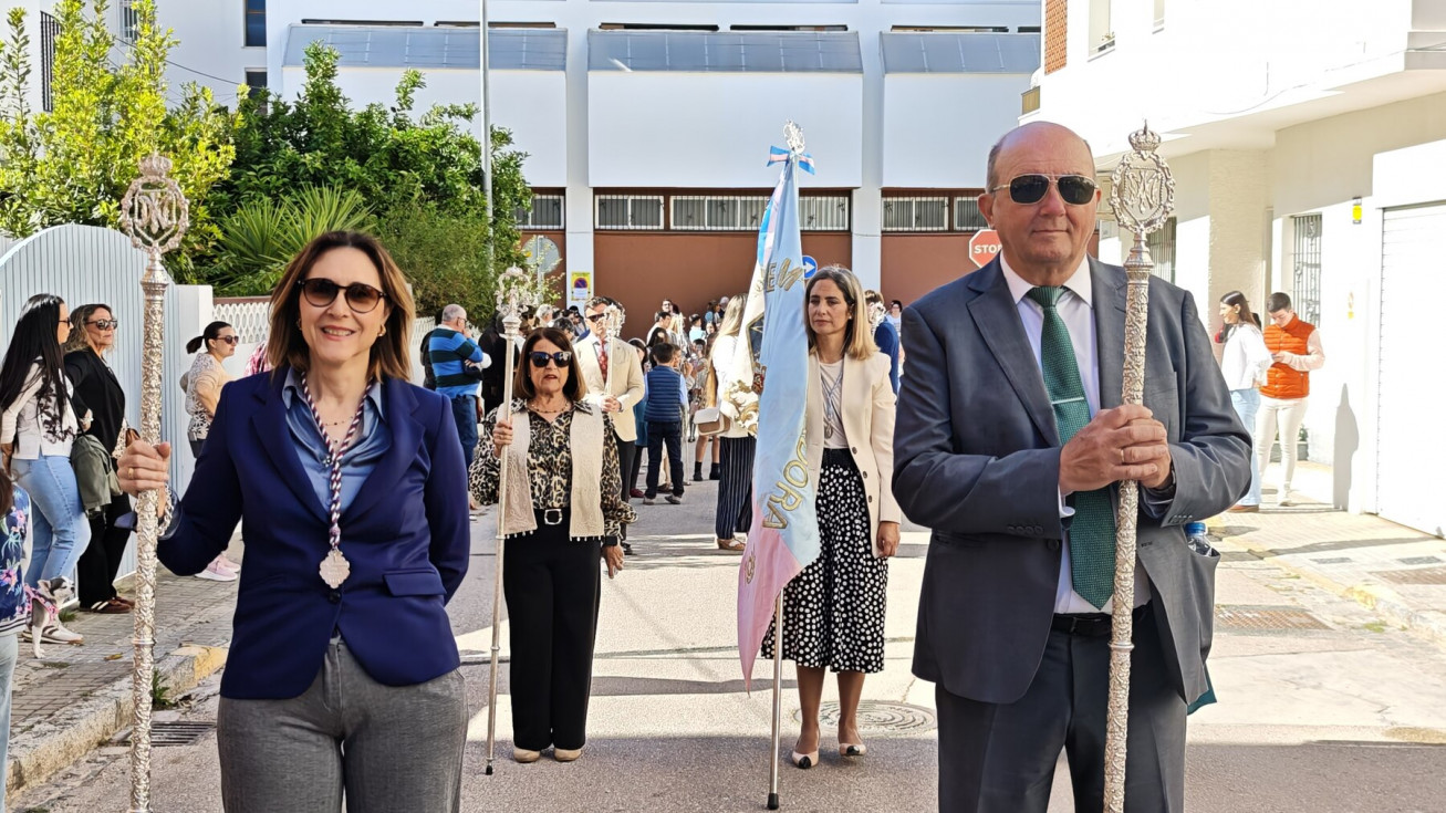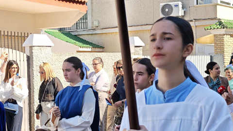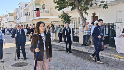Nuestro Padre Jesús Resucitado ha salido por segundo año del colegio Salesianas que lo acoge desde que el Consejo Local de Hermandades y Cofradías cediera la imagen a la comunidad de las Hijas de María Auxiliadora, que se encarga de cuidarlo y organizar su salida a través del Grupo de Fieles de la Sagrada Resurrección de Nuestro Señor Jesucristo que sigue creciendo. Prueba de ello es que en un año ha aumentado el número de asociados y eso hace que el cortejo sea amplio, contando además con representación no solo del colegio de las salesianas Nuestra Señora del Perpetuo Socorro, sino de otras hermandades de penitencia y gloria de la villa de Rota, del Consejo Local de Hermandades y Cofradías, de las asociaciones Hijas de María Auxiliadora y ciudadanos en general. Destacaba hoy en este cortejo, que partía a las 10.30 horas de la parte trasera del centro educativo, el gran número de niños con varas y campanitas agitándolas en señal de júbilo anunciando la resurrección de Jesús.