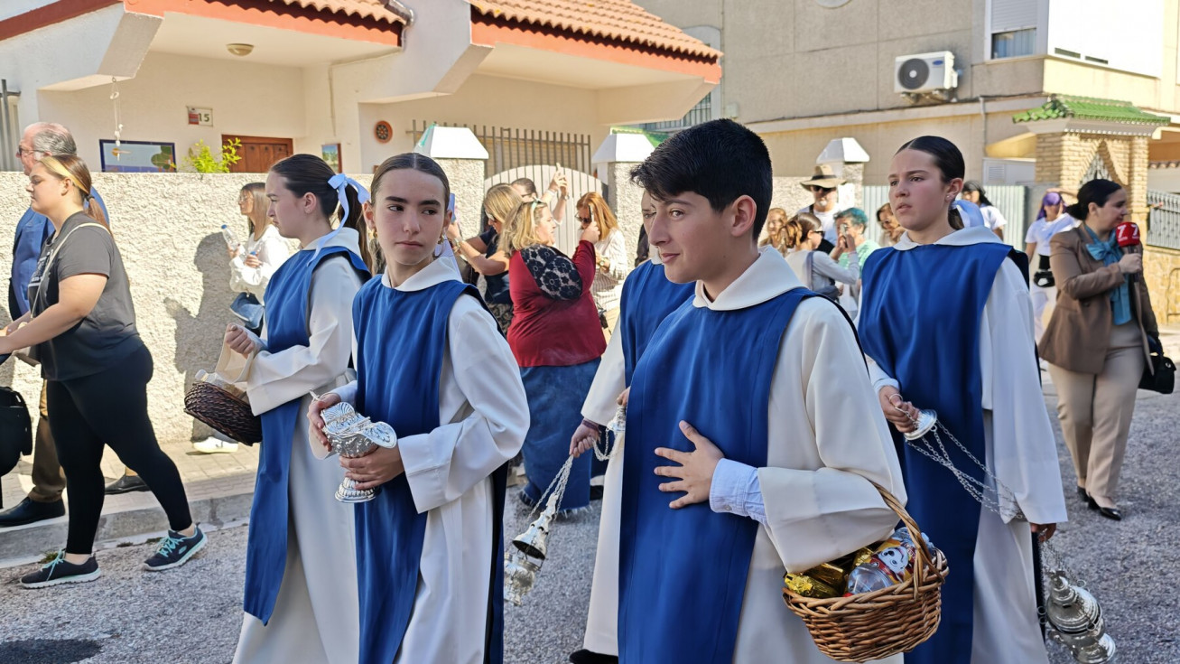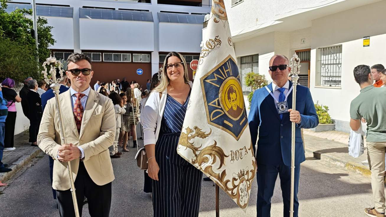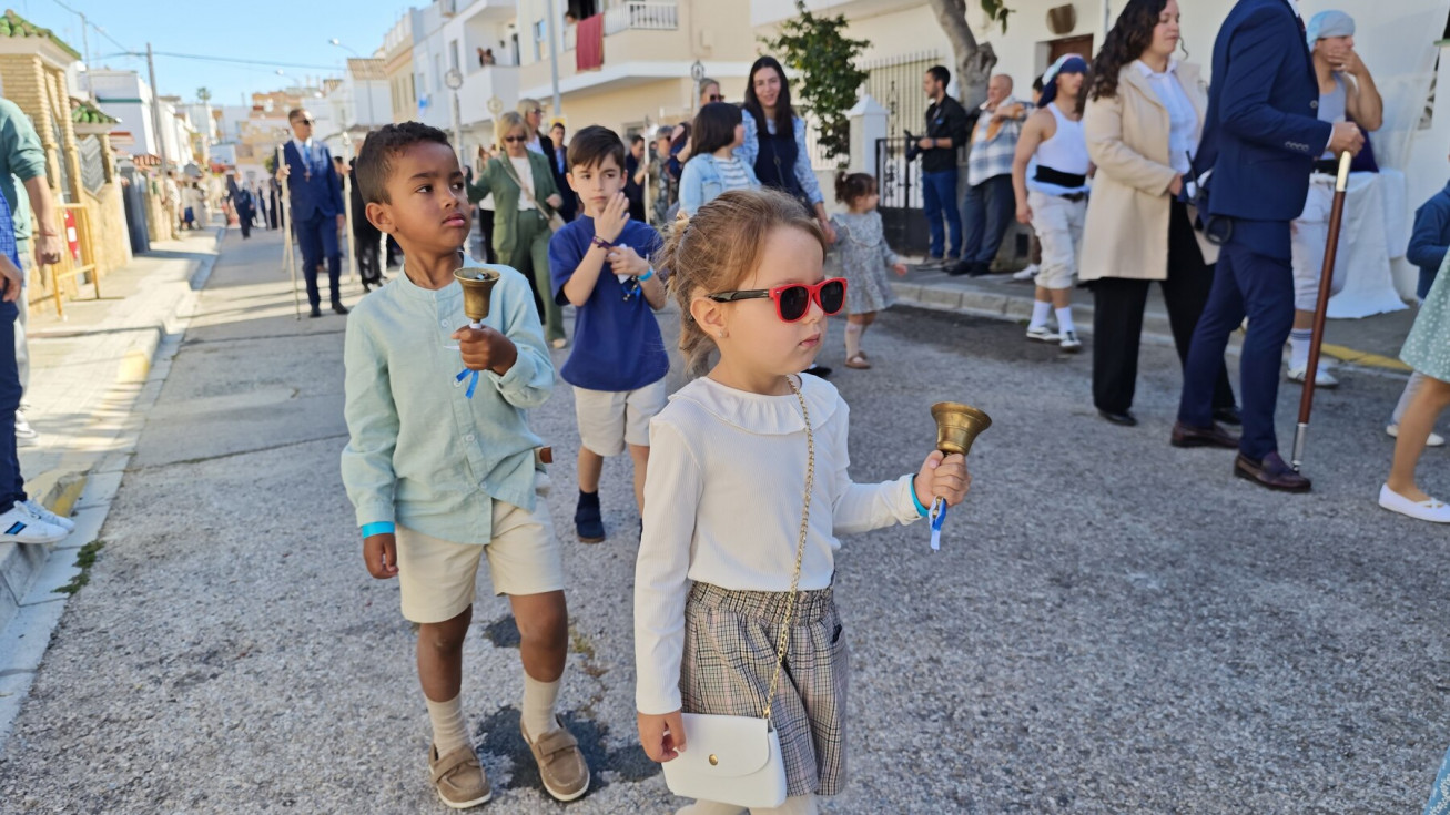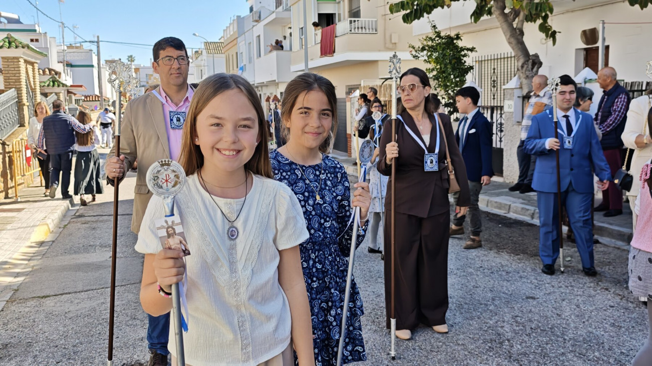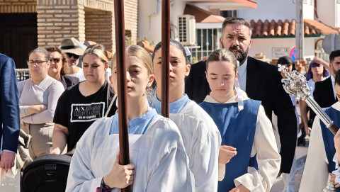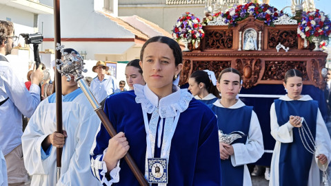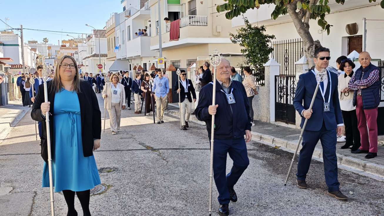 Nuestro Padre Jesús Resucitado ha salido por segundo año del colegio Salesianas que lo acoge desde que el Consejo Local de Hermandades y Cofradías cediera la imagen a la comunidad de las Hijas de María Auxiliadora, que se encarga de cuidarlo y organizar su salida a través del Grupo de Fieles de la Sagrada Resurrección de Nuestro Señor Jesucristo que sigue creciendo. Prueba de ello es que en un año ha aumentado el número de asociados y eso hace que el cortejo sea amplio, contando además con representación no solo del colegio de las salesianas Nuestra Señora del Perpetuo Socorro, sino de otras hermandades de penitencia y gloria de la villa de Rota, del Consejo Local de Hermandades y Cofradías, de las asociaciones Hijas de María Auxiliadora y ciudadanos en general. Destacaba hoy en este cortejo, que partía a las 10.30 horas de la parte trasera del centro educativo, el gran número de niños con varas y campanitas agitándolas en señal de júbilo anunciando la resurrección de Jesús.