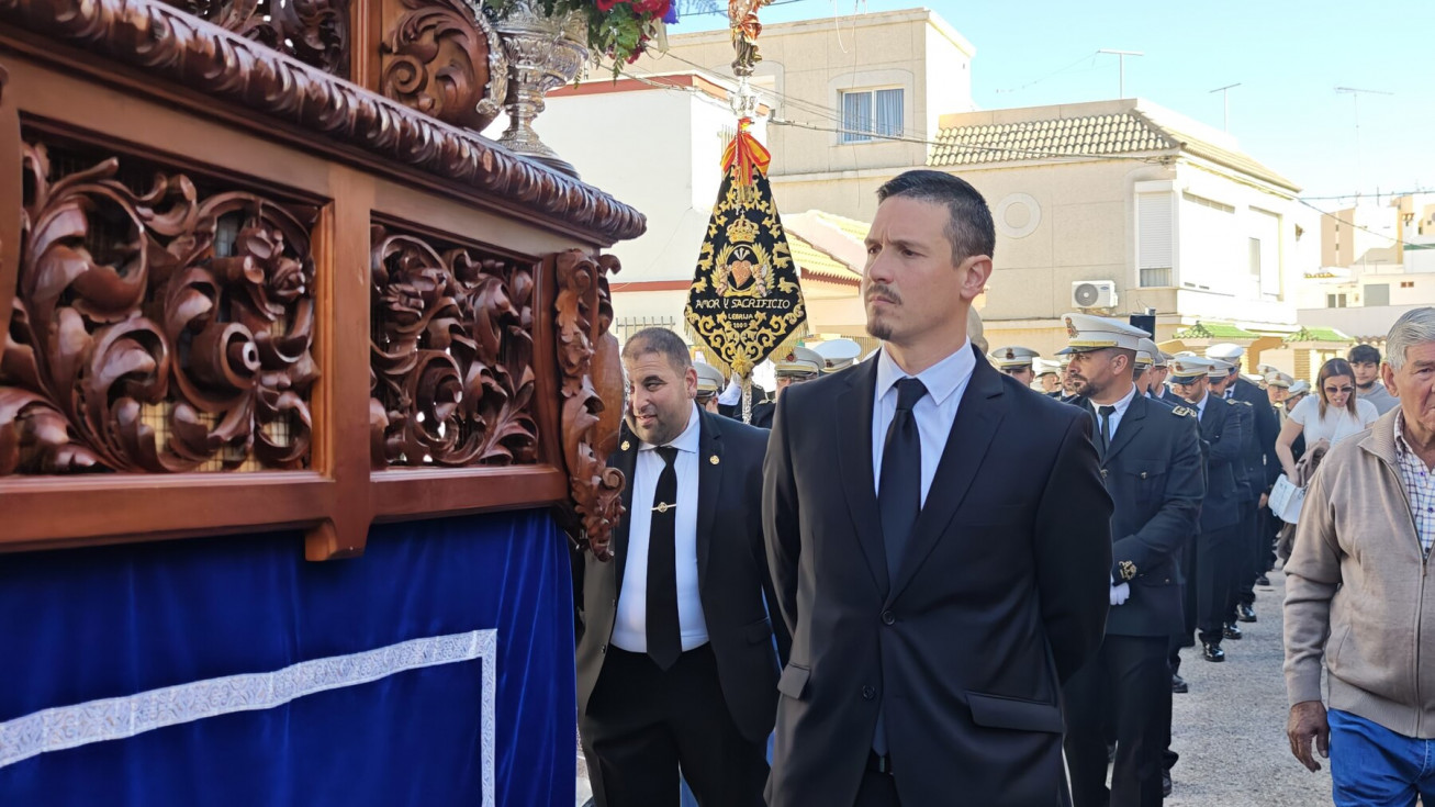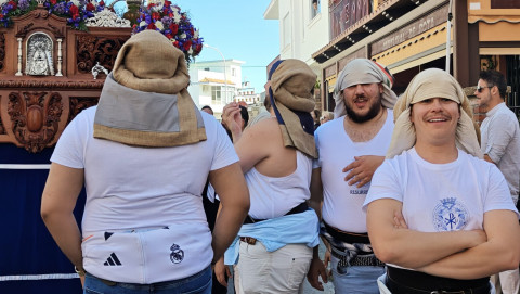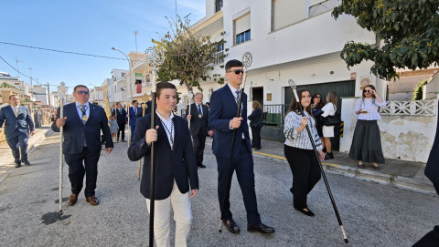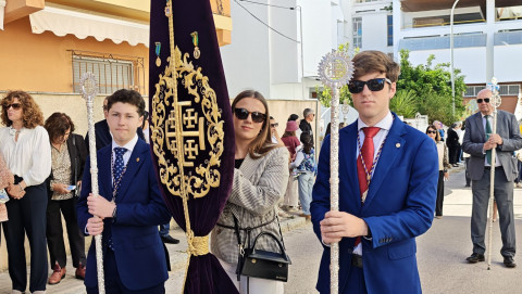 La Banda de Cornetas y Tambores Amor y Sacrificio de Lebrija (Sevilla), con una amplia representación de músicos, ha sido por segundo año la que ha puesto los acordes musicales que se han podido escuchar en todo el recorrido en el que el capataz Manuel Pizones ha estado al frente de una cuadrilla de costaleros jóvenes que viven con ilusión y ganas este día.