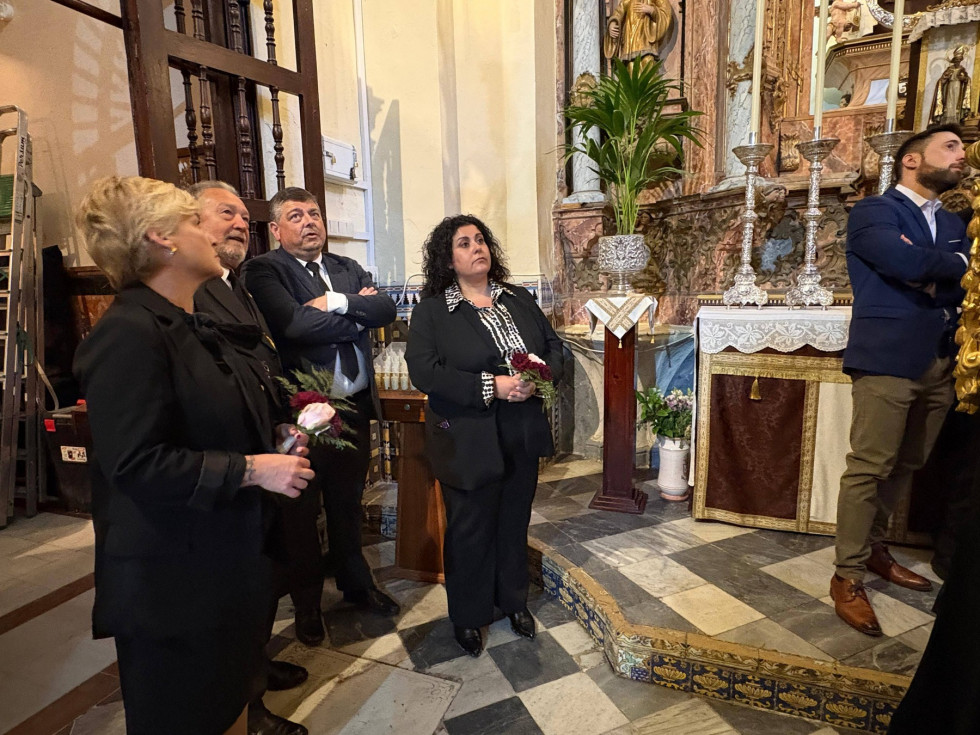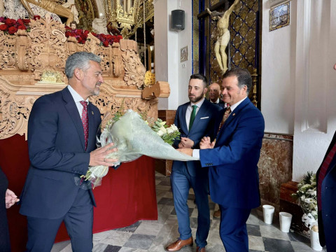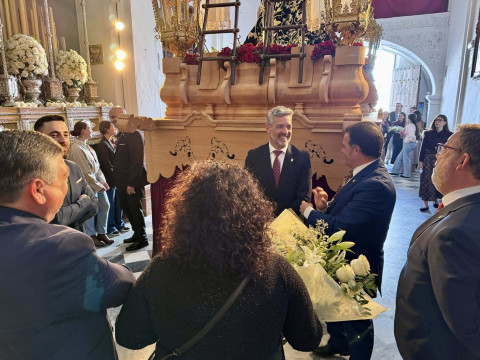 En el pabellón del colegio Nuestra Señora del Perpetuo Socorro, de donde ha partido el cortejo arropando el paso de Jesús, el regidor roteño hizo entrega de un ramo de flores como ofrenda a una imagen con la que se cierra la Semana Santa de Rota.