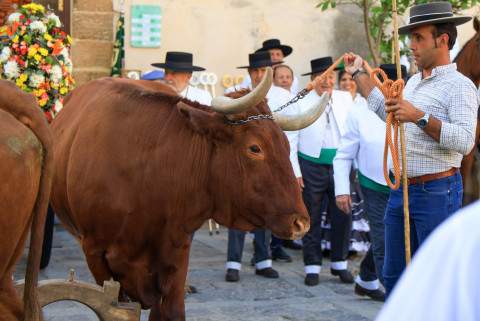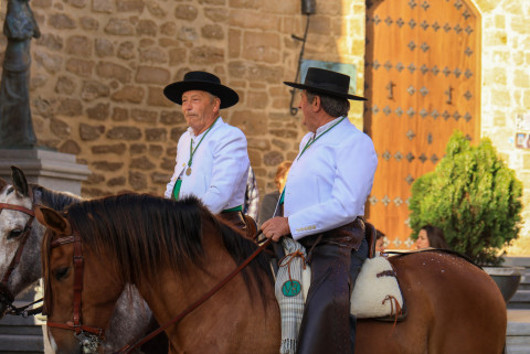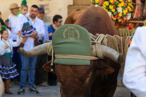 Los hermanos de la Hermandad de San Isidro lo acompañan en la salida que ha tenido lugar pasadas las nueve de la mañana en la plazoleta del Padre Eugenio. La carreta de madera tirada por dos vacas lleva al patrón de los agricultores por las calles de la localidad. Junto a él, romeros de chaquetilla blanca y pañuelo verde, bien a caballo, andando o en carrozas lo acompañan en un día que ha amanecido primaveral y con temperaturas que se esperan calurosas.