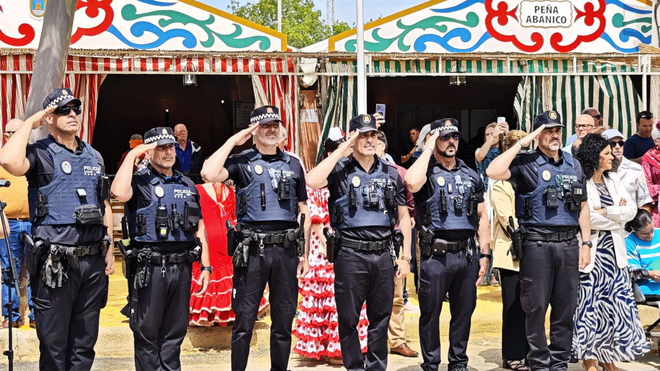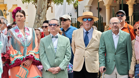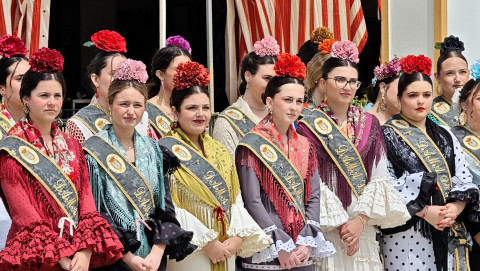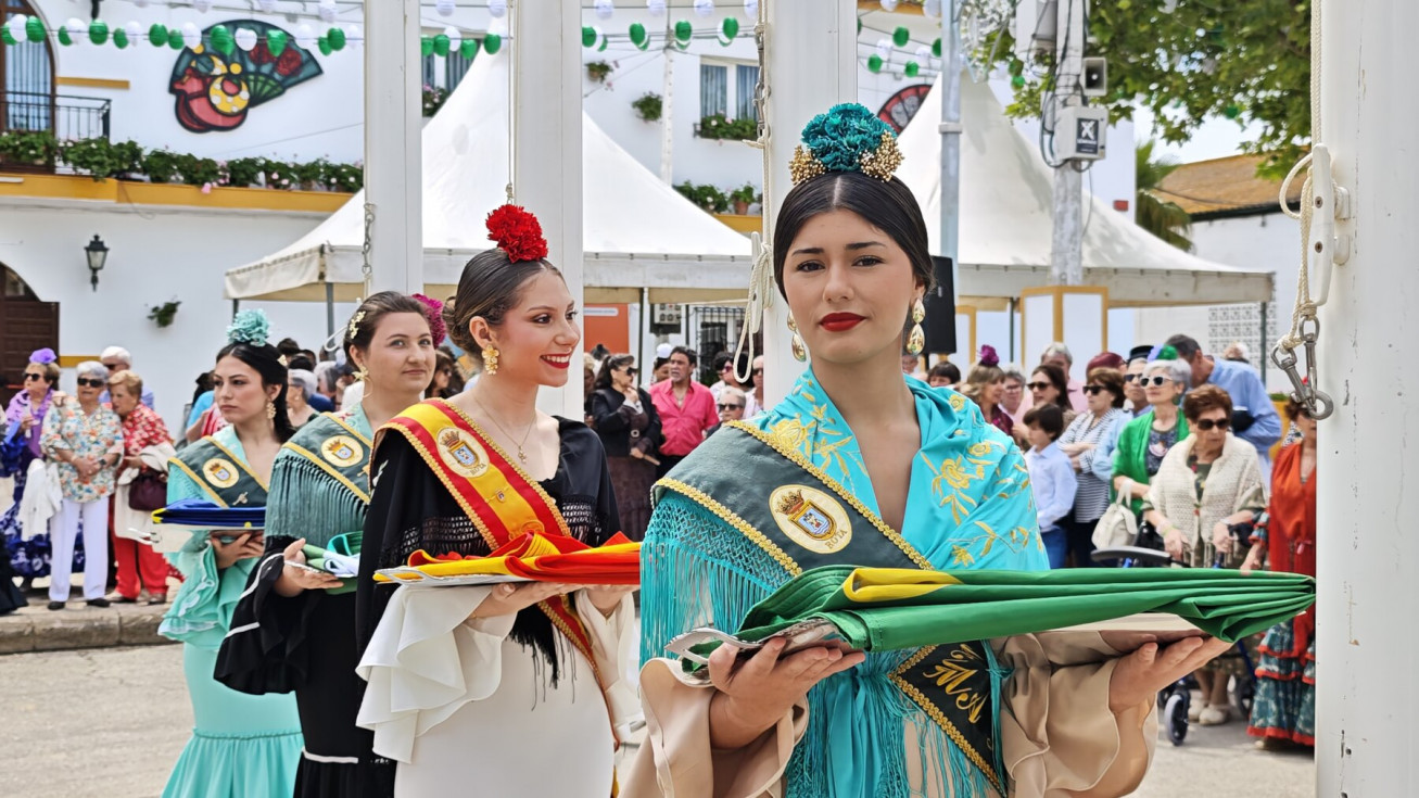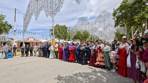 Las damas del Rosario han portado las insignias que cuatro pregoneros de feria se han encargado de izar ante la mirada de ciudadanos y autoridades civiles y militares que se han dado cita en esta primera jornada de feria que toma el relevo de una noche de miércoles animada.